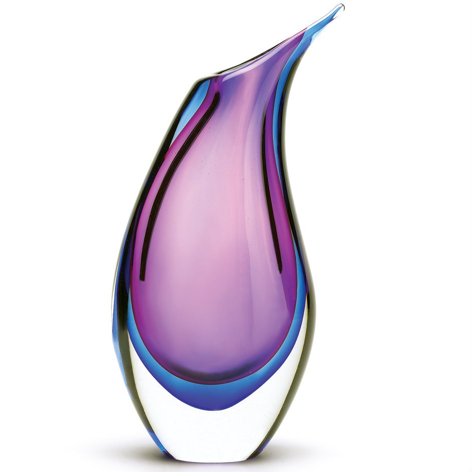 With the purple core catching the light, surrounded by the beautiful blue edging and clear glass base, this vase is art in itself. At nearly 16 inches tall, it can stand on its own as a focal point in a room. 12.4 pounds. Glass 7 x 4 x 15.75 inches tall.
