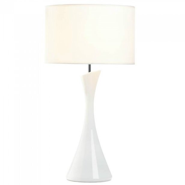The modern and sleek design of this ceramic table lamp will certainly shed a stylish light! The white base features a unique curved design, and the white fabric shade is the perfect finishing touch to this illuminating work of art. Uses LED E26 (60W) light bulb (not included). Power cord is 67 inches long. 3.2 pounds. 12.5 inches in diameter x 24 inches tall. Base: 6.5 inches in diameter x 18.4 inches tall. Shade: 12.5 inches in diameter x 8 inches tall. Ceramic with fabric shade.